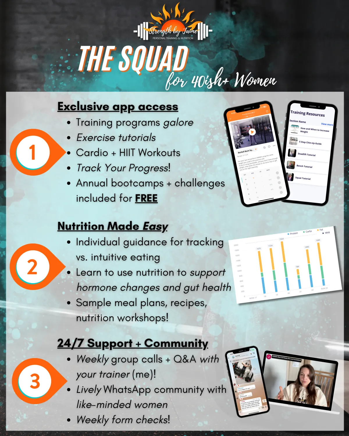 Live coaching and Q&A weekly with me, your head trainer and nutrition coach, so you can get your questions answered and feel supported along the way. Each week there will be an instructional topic where we will cover macros, nutrition deep dives, secrets of building muscle for women, hormone optimization, etc.